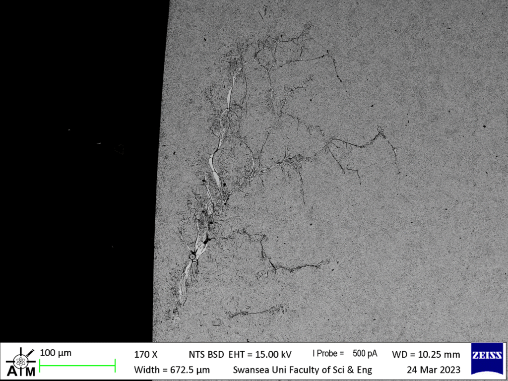 An example SEM image (taken at AIM, Swansea University) illustrates the characteristic features of WEC damage. A small non-metallic inclusion appears to act as the initiation site, with two early-stage “butterfly wings” forming around it. From this region, cracks propagate both parallel to the surface and deeper into the material. Portions of the crack network are bordered by WEAs, indicating significant local microstructural transformation. With continued rolling contact, these subsurface cracks eventually coalesce with the surface, producing a spall or pit.
