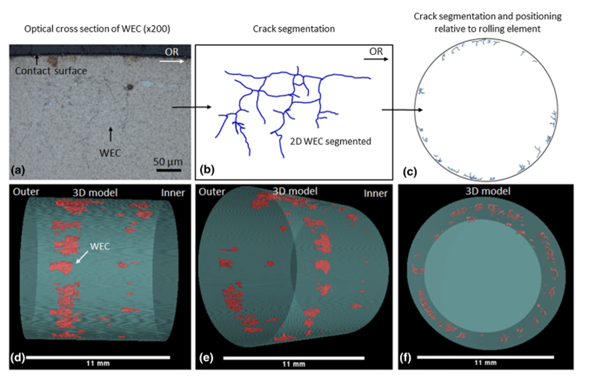 White etching cracks consist of a network of subsurface cracks surrounded by regions of altered microstructure known as white etching areas (WEAs). These crack networks are typically associated with subsurface features such as non-metallic inclusions.