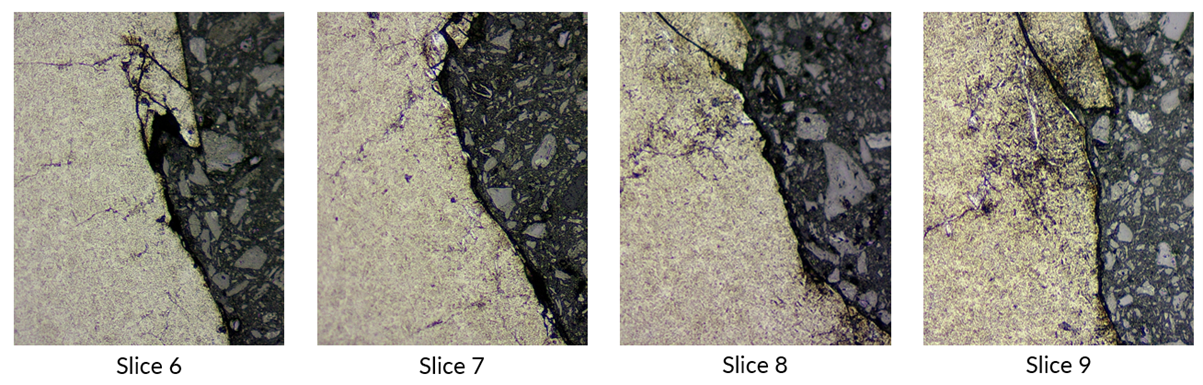 Serial sectioning of a pitted roller (shown below) shows that these crack networks extend through the subsurface. Each section—taken approximately 100 µm apart—reveals a different cross-section of the same interconnected damage structure.