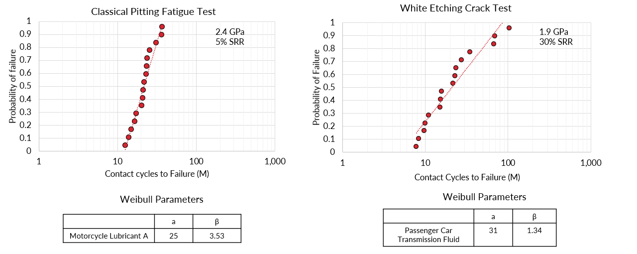The test results shown below use a 3 ring on roller test machine with multiple repeat tests. The classical pitting fatigue test results are taken from the data by Smeeth (2) which uses a SRR of 5% and 2.4 GPa, with 10W-40 motorcycle oils. The white etching crack tests use a SRR of 30 % and 1.9 GPa, and a 75W80 transmission oil.