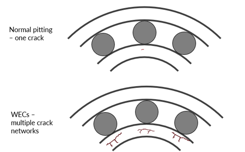 At first glance, WEC failures may appear similar to classical subsurface-initiated pitting, a mechanism that has been well understood for decades. The key differences between the two mechanisms is how the cracks form, how many initiation sites exist, and how the bearing fails statistically.